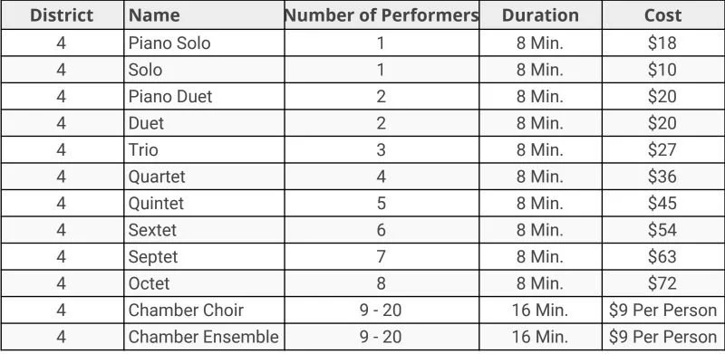 Piano accompanists must be arranged on your own. The accompanist fee will usually be due on performance day. Students that drop out at the last minute will still be expected to compensate the accompanist for preparation time. NOTE: This accompanist fee is paid in addition to the solo registration fee.